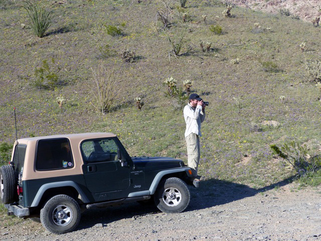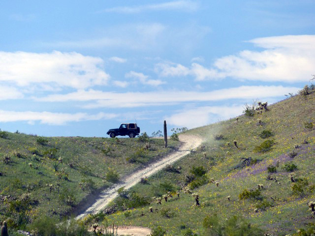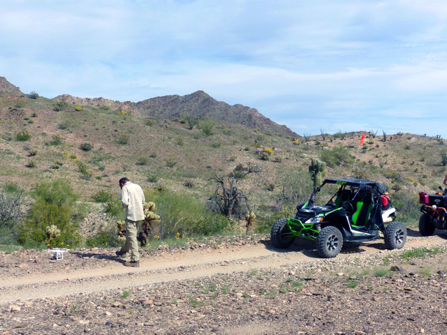 It’s strange to see one in the backcountry. And today it reminds me that however focused we may be in a moment, there’re layers of engagement underneath, always. Thoughts slip in and out; no two people carrying the same context. We relocate for a different shot. We get a lot of shots. Mason has a “shot list” of content he wants—he’s envisioned the end-product and also knows that one of the best things to have in the editing suite is a lot of good B-roll to use for cutaways and covers. We are also opportunistic. When an idea hits, or a particular hillside catches attention, we adjust. This happens when moving from one semi-planned location to another. We crest a rise and starting down the other side the little dirt track slides below a gentle hillside covered in color. Wildflowers, grasses, ocotillos; a great backdrop. We unload and set-up the gear again. Here’s the shot we’re looking for: the guys driving slowly by and admiring the scenery.